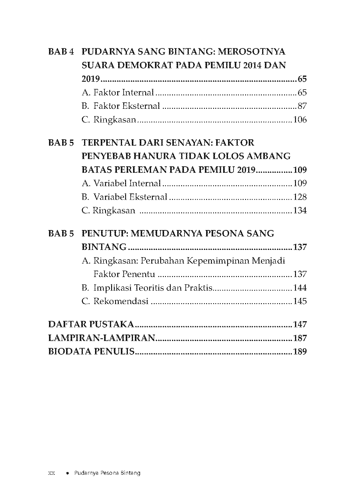 Dalam kepustakaan ilmu politik, topik partai politik menjadi daya tarik tersendiri untuk selalu ditelaah mengingat perkembangannya yang dinamis dari waktu ke waktu. Tak sedikit publik berharap pada partai politik agar mampu mewujudkan aspirasi dan kepentingan mereka, namun banyak pula yang mengritik dan menghujat karena ketidakmampuan partai dalam melakukan perubahan signifikan. Tren global mutakhir di negara-negara demokrasi gelombang ketiga menunjukkan lemahnya pelembagaan partai politik. Hal ini pun berdampak pada buruknya kinerja partai politik di Indonesia. Partai Demokrat dan Partai Hanura menjadi dua potret partai politik mutakhir di Indonesia yang merepresentasikan lemahnya modernisasi partai yang berdampak pada buruknya kinerja mereka di panggung pemilu. Di sinilah, buku ini mencoba menelusuri apa saja faktor-faktor penyebab buruknya kinerja kedua partai tersebut dalam kontestasi pemilu.