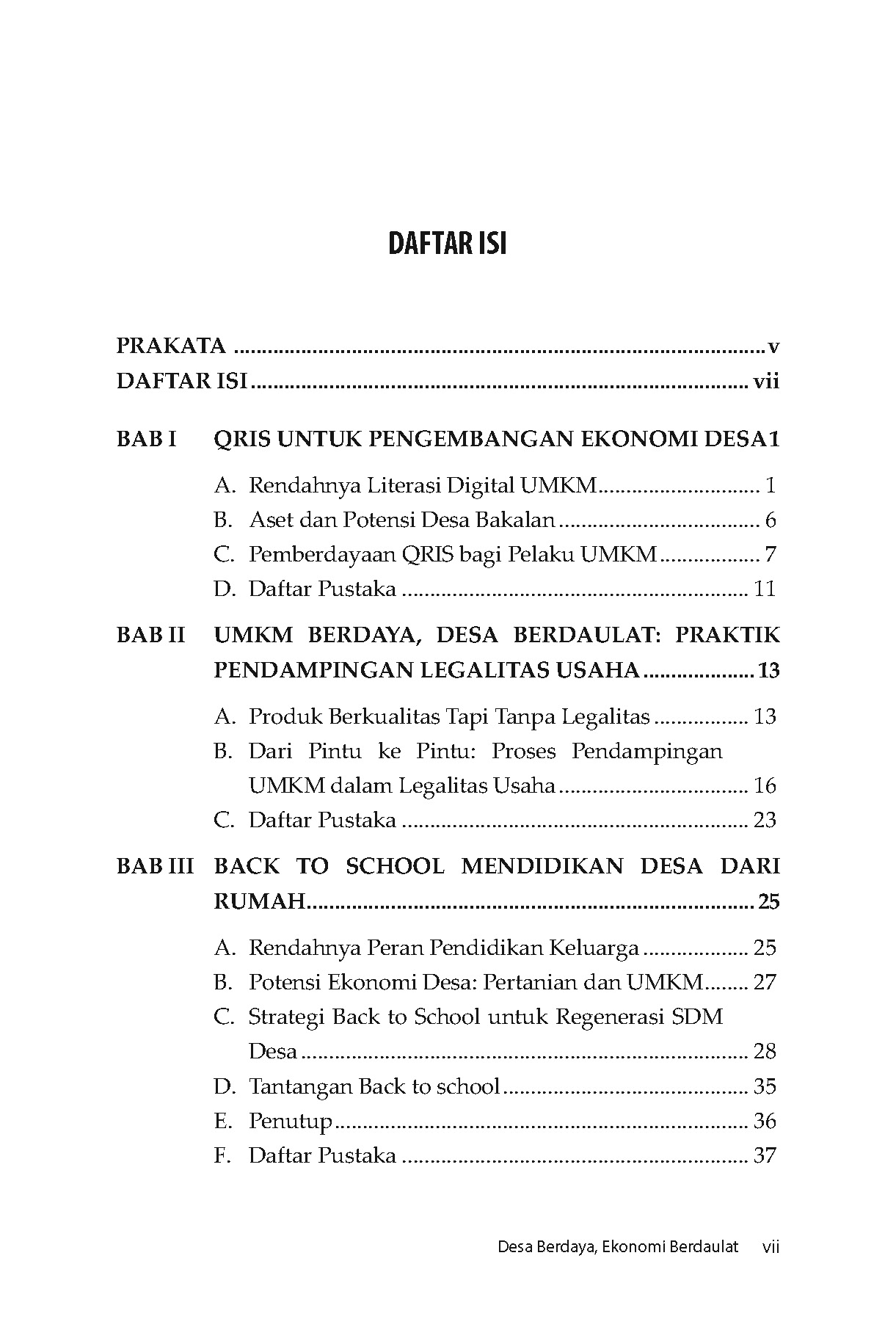 baru bagi roda ekonomi desa. Bab kedua menguatkan gagasan tersebut melalui legalitas UMKM, mengajarkan bahwa izin usaha bukan sebatas legitimasi administratif, tetapi jembatan menuju kepercayaan pasar dan kemandirian desa. Sementara Bab ketiga menyentuh aspek pendidikan, menegaskan bahwa pembangunan ekonomi tidak dapat dilepaskan dari kualitas sumber daya manusia—dan sekolah pertama bagi anak adalah rumah, keluarga, dan lingkungan sosialnya.