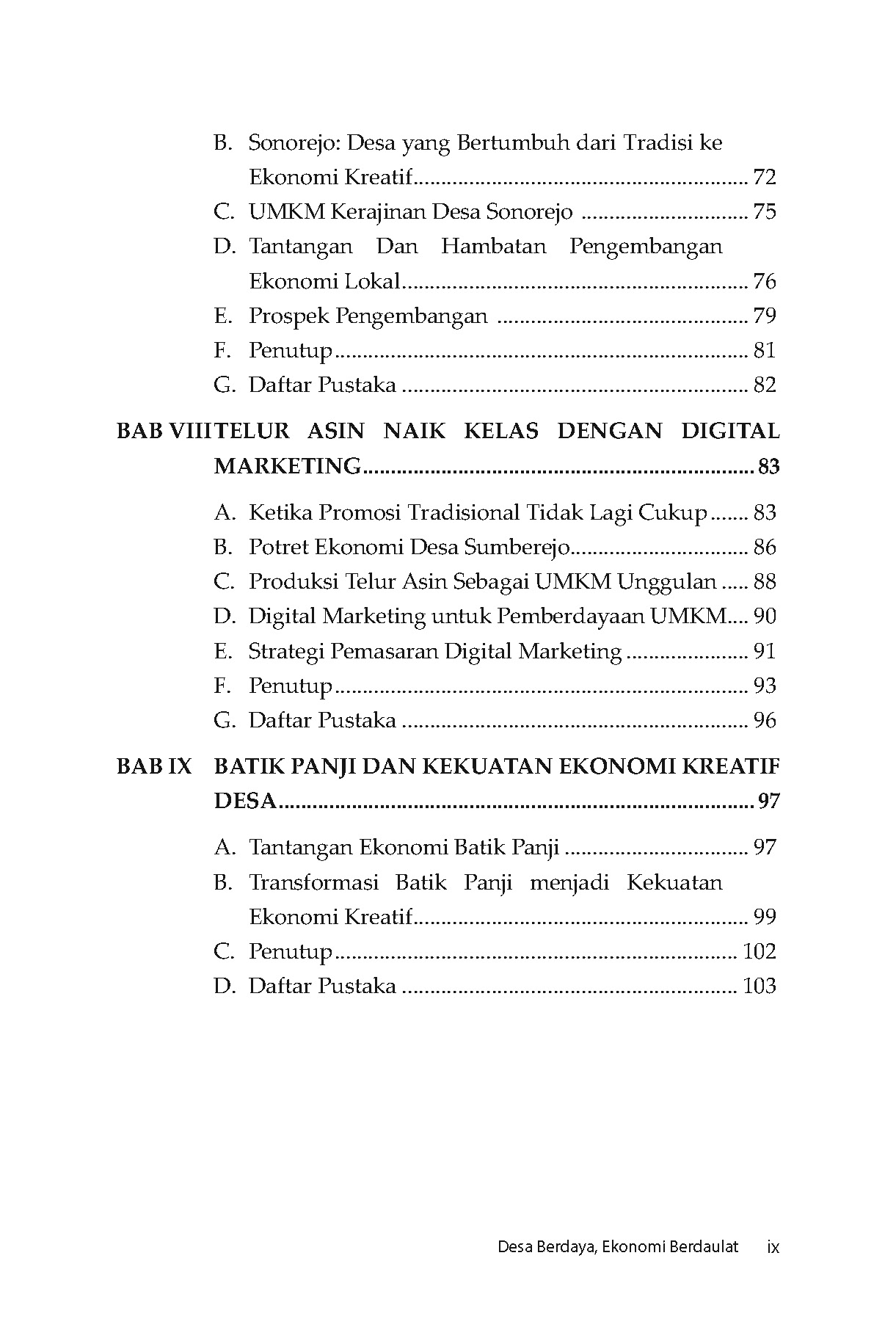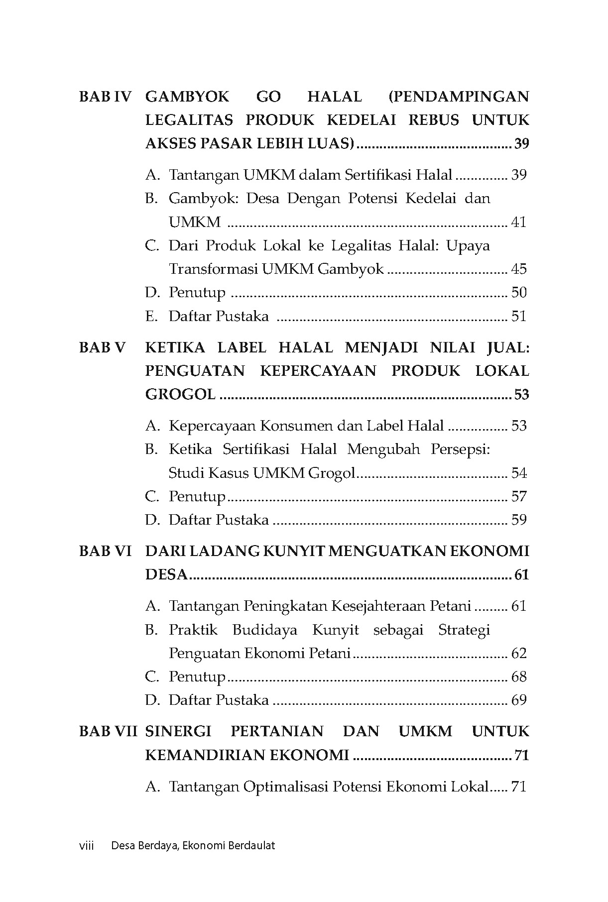 Bab keempat hingga kedelapan membawa pembaca menyelami upaya konkret pengembangan sektor ekonomi melalui produk unggulan desa: kedelai rebus bersertifikat halal, strategi branding halal untuk produk lokal, budidaya kunyit yang menyejahterakan petani, sinergi sektor pertanian dan UMKM, serta digital marketing yang mampu mengangkat telur asin menjadi produk berdaya saing. Rangkaian bab tersebut memperlihatkan bahwa kemandirian ekonomi desa bukan hanya persoalan produksi, tetapi juga pemasaran, legalitas, inovasi, literasi digital, dan keberanian untuk bertransformasi.