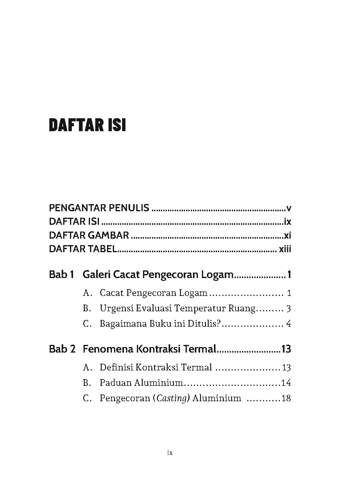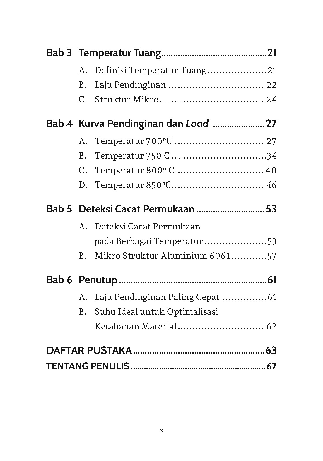 Eksplorasi yang lebih mendalam tentu masih sangat dinantikan. Misalnya, masih diperlukan eksplorasi mengenai variasi temperatur lain dengan menvariasikan bentuk cetakan dan menggunakan jenis paduan lainnya. Pasalnya, buku ini tentu masih jauh dari sempurna. Akhirnya, kritik yang konstruktif dari pembaca sangat dinantikan. Semoga bermanfaat!