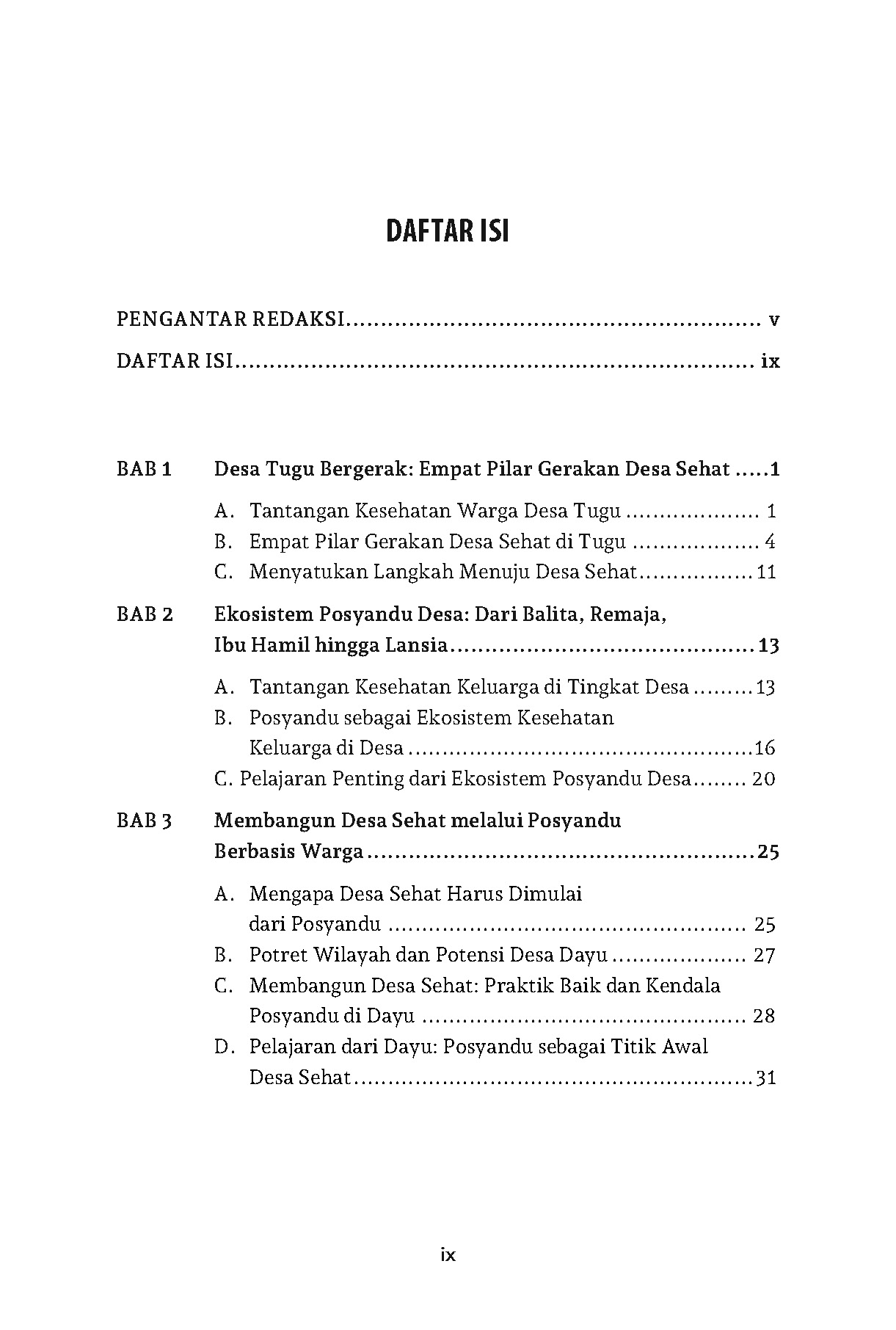 Bab-bab awal (Bab 1–3) disusun untuk memberikan fondasi konseptual tentang bagaimana sebuah desa membangun ekosistem kesehatan berbasis warga. Tulisan tentang Desa Tugu sebagai model gerakan desa sehat, ekosistem posyandu desa, dan posyandu berbasis warga menunjukkan bahwa layanan kesehatan yang kuat tidak lahir dari program sesaat, melainkan dari upaya kolektif yang terencana. Di sini, pembaca diajak melihat bahwa posyandu bukan sekadar tempat penimbangan balita, tetapi bagian dari ekosistem desa sehat yang menautkan kader, pemerintah desa, lembaga pendidikan, dan keluarga. Inilah sebabnya bab-bab ini ditempatkan di awal: untuk mengantar pembaca memahami bahwa gerakan desa sehat selalu dimulai dari ekosistem yang dibangun dan dirawat bersama.