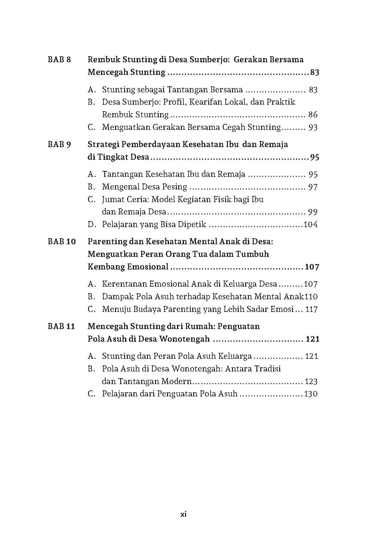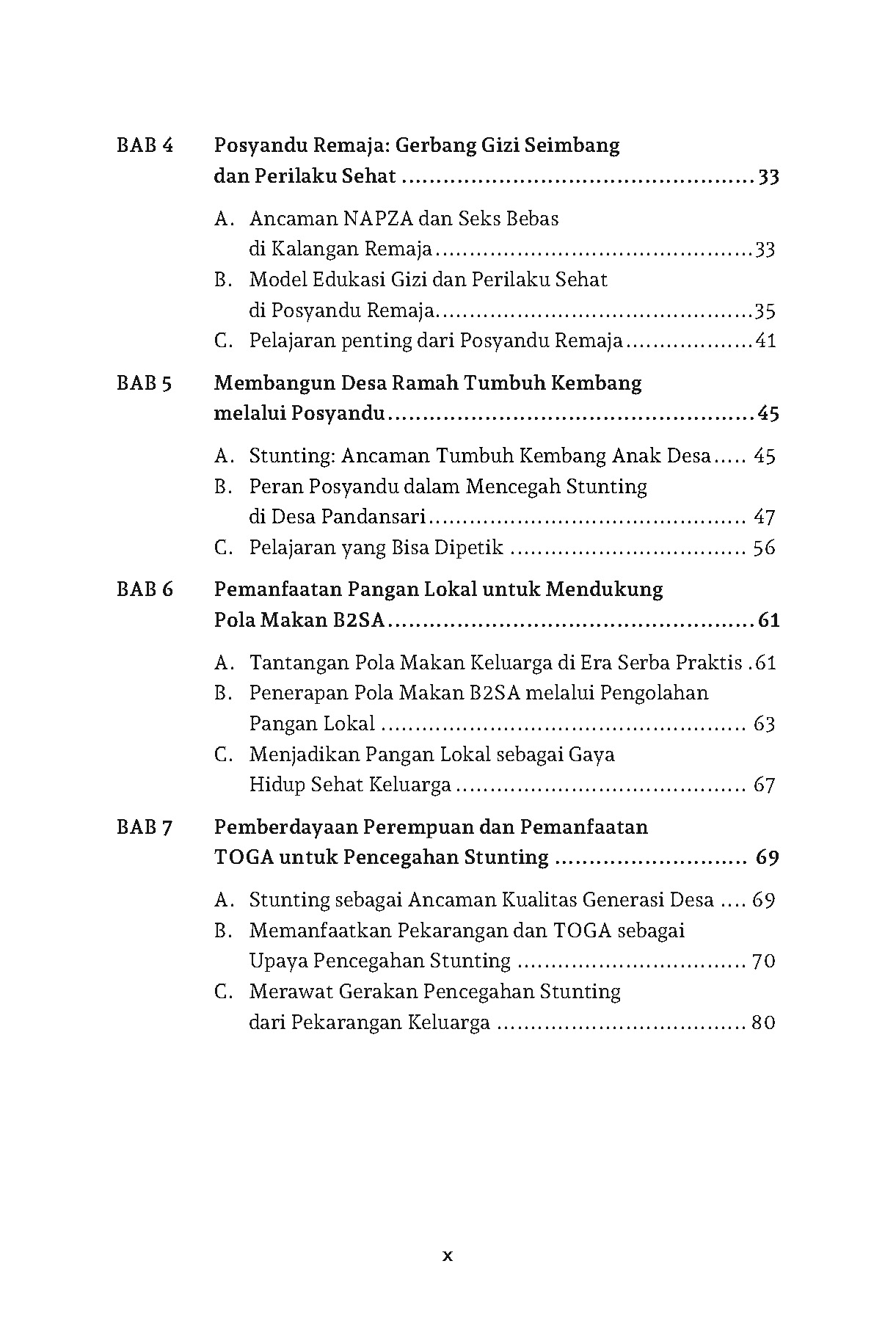 Bagian tengah buku (Bab 6–8) menyoroti secara lebih spesifik dimensi gizi dan pangan sebagai penopang utama pencegahan stunting. Pemanfaatan pangan lokal untuk pola makan Beragam, Bergizi, Seimbang, dan Aman (B2SA) menggambarkan bahwa ketahanan gizi keluarga bisa dibangun dari sumber daya yang ada di sekitar rumah, bukan hanya dari produk pangan pabrikan. Pemberdayaan perempuan melalui pemanfaatan Tanaman Obat Keluarga (TOGA) memperlihatkan bahwa pekarangan dapat menjadi ruang edukasi sekaligus praktik nyata kesehatan preventif. Rembuk stunting di tingkat desa kemudian memperlihatkan bagaimana isu gizi dan tumbuh kembang anak diangkat ke forum kolektif, sehingga pencegahan stunting tidak lagi berhenti pada ranah klinis, tetapi naik kelas menjadi agenda sosial dan politik desa.