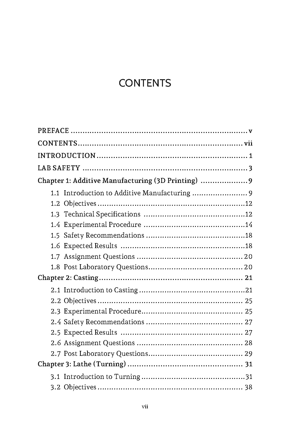 Secara umum, buku ini membahas berbagai proses manufaktur utama seperti 3D printing (additive manufacturing), casting, lathe (turning), milling (manual dan CNC), injection molding, hingga welding. Setiap bab disusun secara sistematis, mulai dari pengenalan konsep, tujuan pembelajaran, spesifikasi teknis, langkah kerja praktikum, hingga evaluasi hasil. Struktur ini membantu mahasiswa belajar secara bertahap dan terarah, sehingga kompetensi teknis dapat berkembang dengan baik.