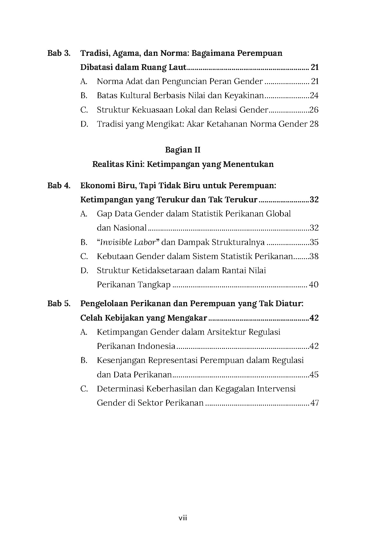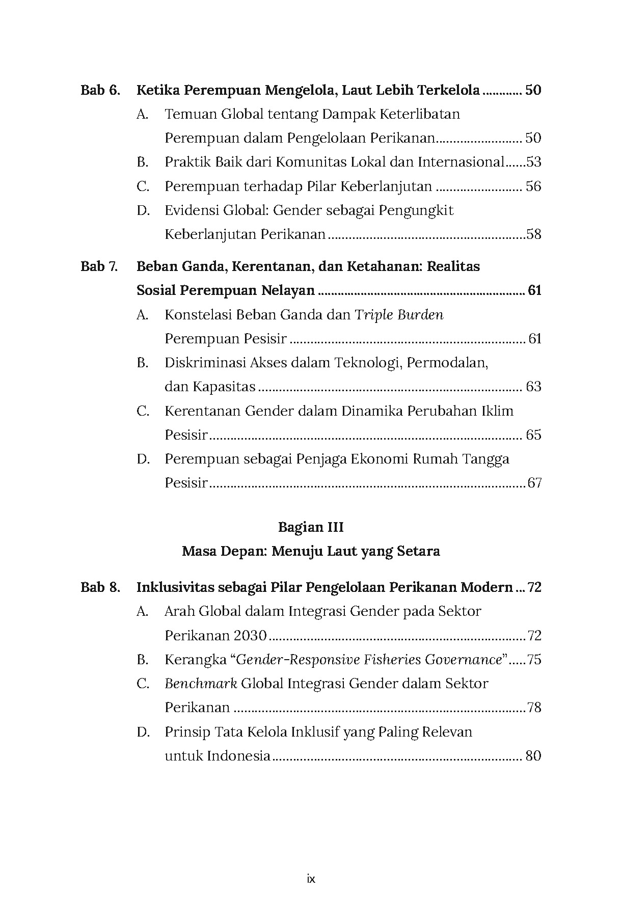 Buku ini hadir sebagai undangan untuk melihat laut Indonesia melalui lensa kesetaraan gender. Pembaca diajak menyaksikan perempuan yang diam-diam membangun, menjaga, dan menuntun masa depan perikanan tangkap. Setiap bab merupakan peta perjalanan menuju pengelolaan laut yang inklusif, adil, dan berkelanjutan. Laut yang setara menjadi tujuan bersama, bukan utopia, ketika keberlanjutan dijalankan dengan keadilan dan keberanian memandang manusia secara setara.
