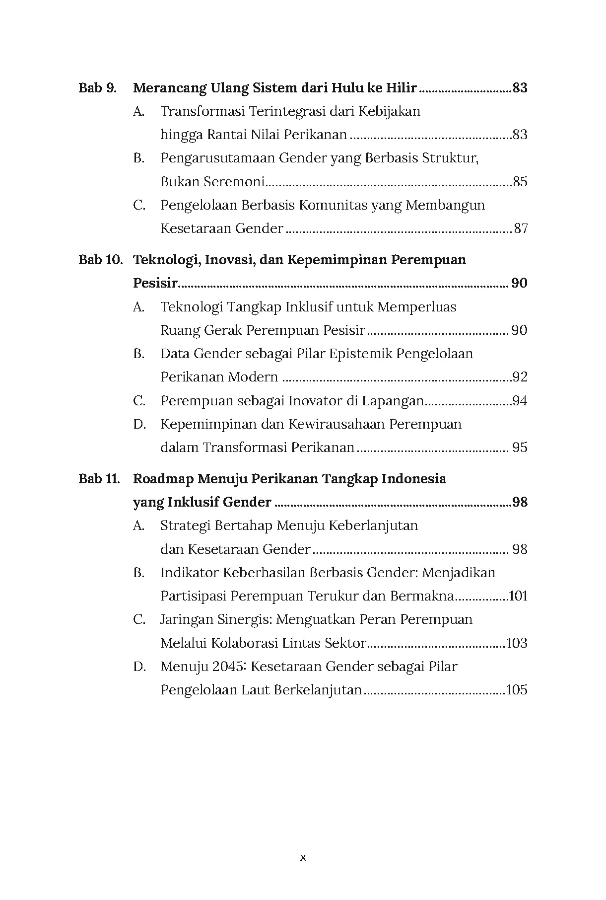 Buku ini menyoroti praktik baik di tingkat komunitas dan internasional yang membuktikan dampak positif keterlibatan perempuan dalam pengelolaan perikanan. Integrasi gender menjadi pengungkit keberlanjutan: laut lebih terkelola, rantai nilai lebih adil, dan komunitas pesisir lebih tangguh. Kerangka “Gender-Responsive Fisheries Governance” menegaskan bahwa pengarusutamaan gender harus berbasis struktur, bukan seremonial, sehingga kesetaraan menjadi fondasi pengelolaan laut modern. Harapan masa depan terletak pada teknologi inklusif, kepemimpinan perempuan, dan strategi terintegrasi dari hulu hingga hilir. Perempuan pesisir menjadi inovator, pengawas, dan penggerak perubahan yang memperkuat ketahanan sosial-ekologis. Roadmap menuju 2045 menegaskan bahwa laut yang setara bukan sekadar visi, tetapi kemungkinan nyata yang bisa diwujudkan dengan keberanian, kolaborasi lintas sektor, dan pengakuan penuh terhadap peran perempuan.