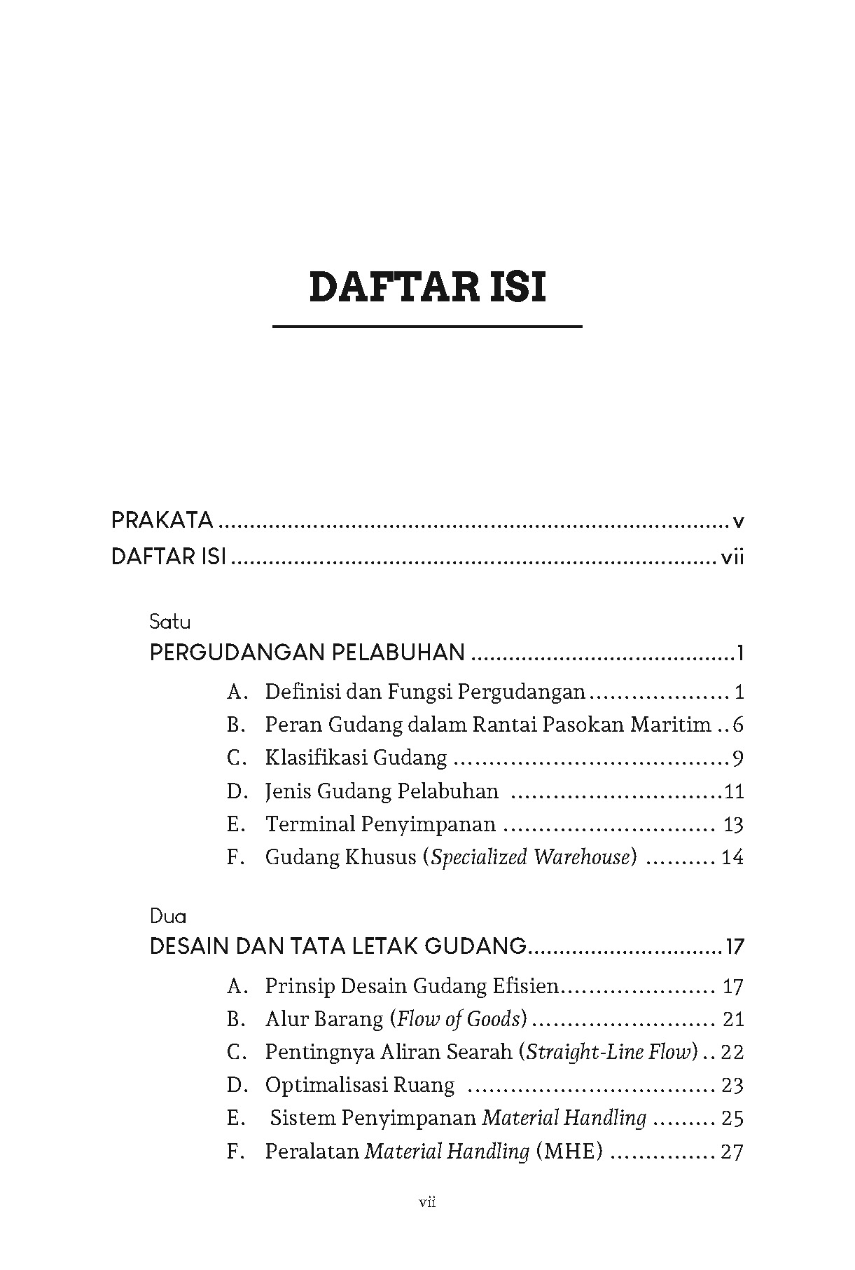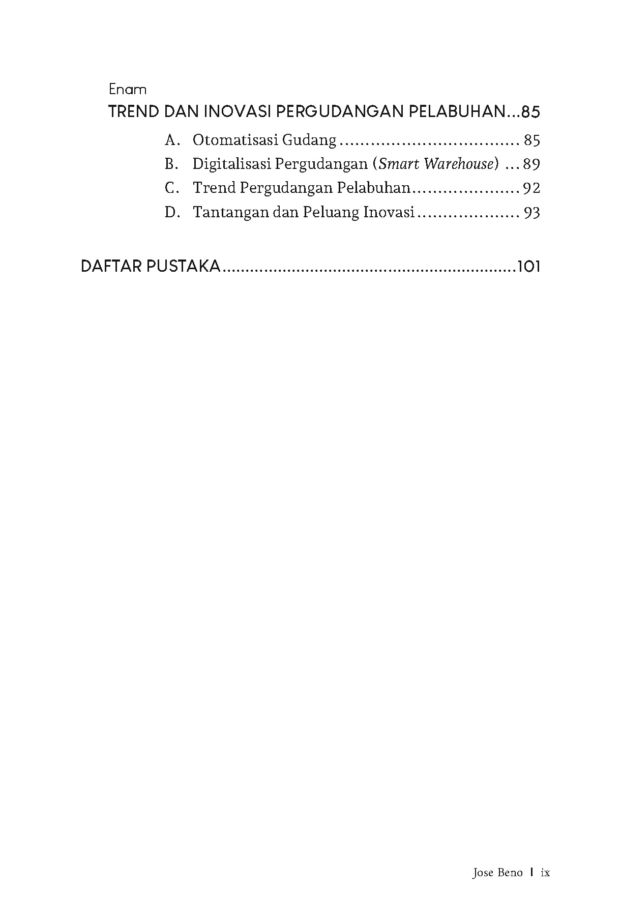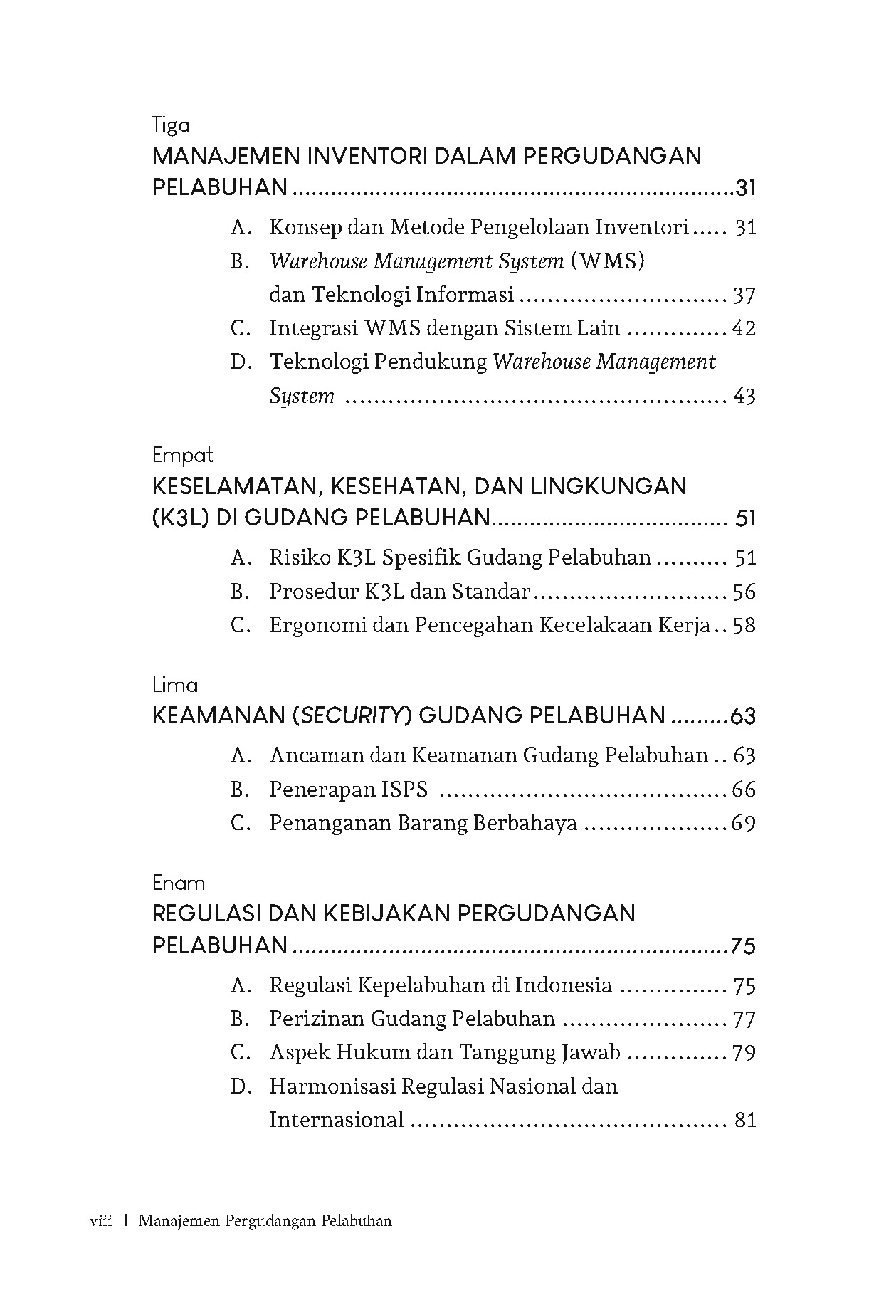 Buku ini merupakan pengembangan dari materi-materi yang disampaikan dalam perkuliahan manajemen pergudangan pelabuhan. Harapannya, buku ini dapat menjadi salah satu referensi bagi akademisi, bahkan mahasiswa dalam menyelami manajemen pergudangan pelabuhan. Sebagaimana kita pahami bersama, gudang pelabuhan merupakan suatu terma yang penting, mengingat negara kita didominasi oleh perairan. Indonesia juga menjadi jalur perdagangan lintas negara, bahkan lintas benua.