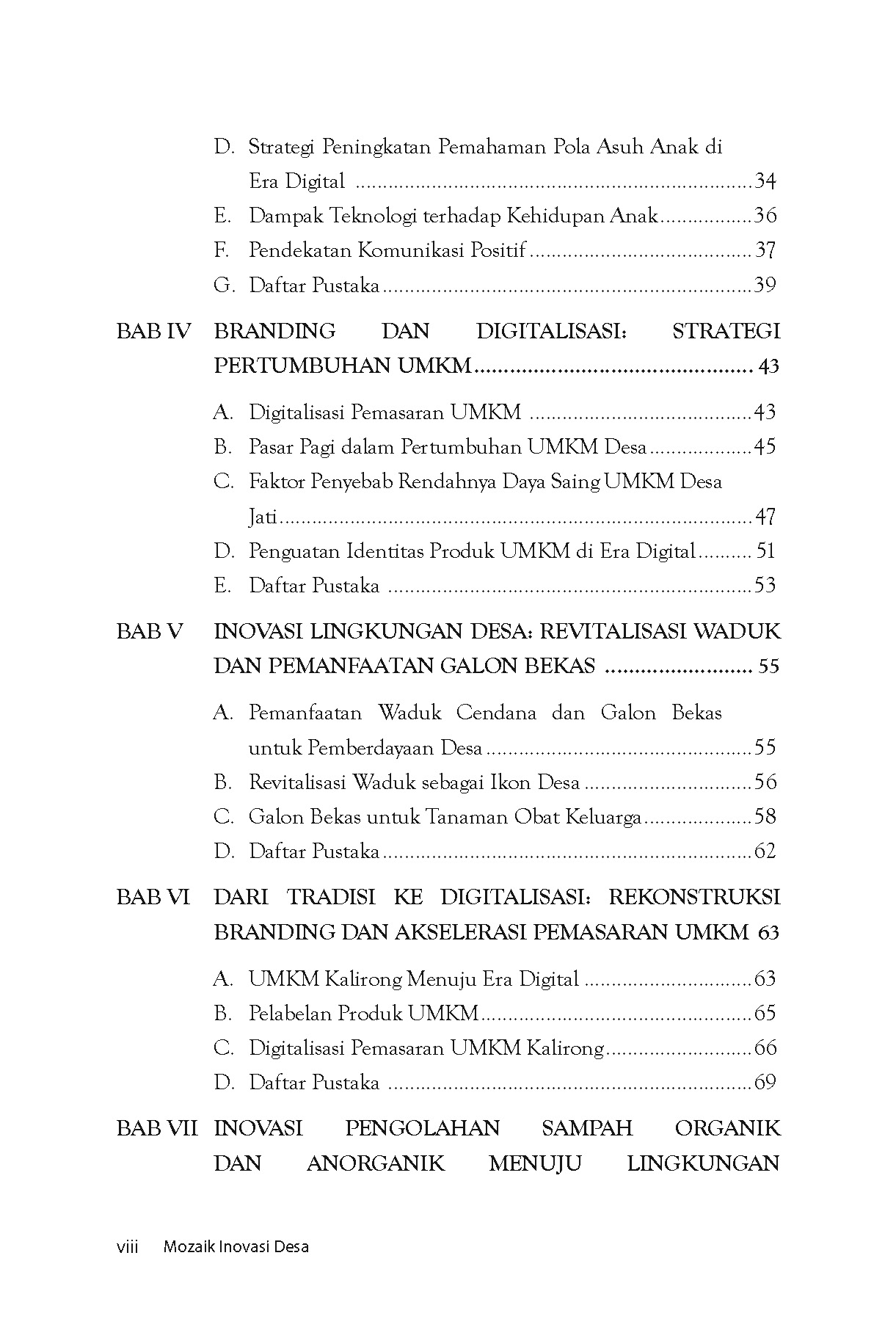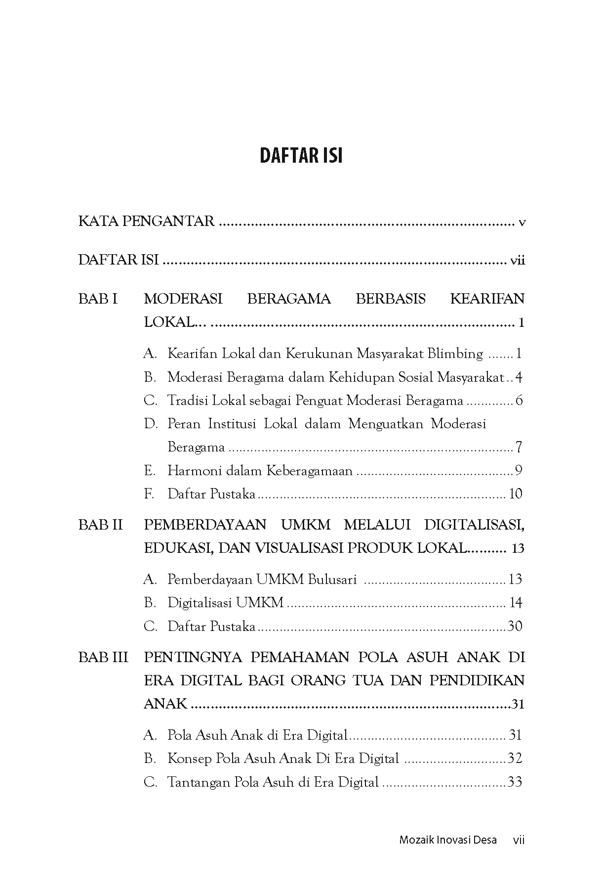 Buku mozaik inovasi desa umkm digital, lingkungan berkelanjutan, dan harmoni sosial-religius hadir sebagai kumpulan tulisan yang menyoroti dinamika perubahan sosial, ekonomi, dan budaya di tengah arus modernisasi dan digitalisasi. Dalam era yang semakin terhubung oleh teknologi, masyarakat menghadapi tantangan sekaligus peluang untuk mengembangkan kapasitas, menjaga warisan