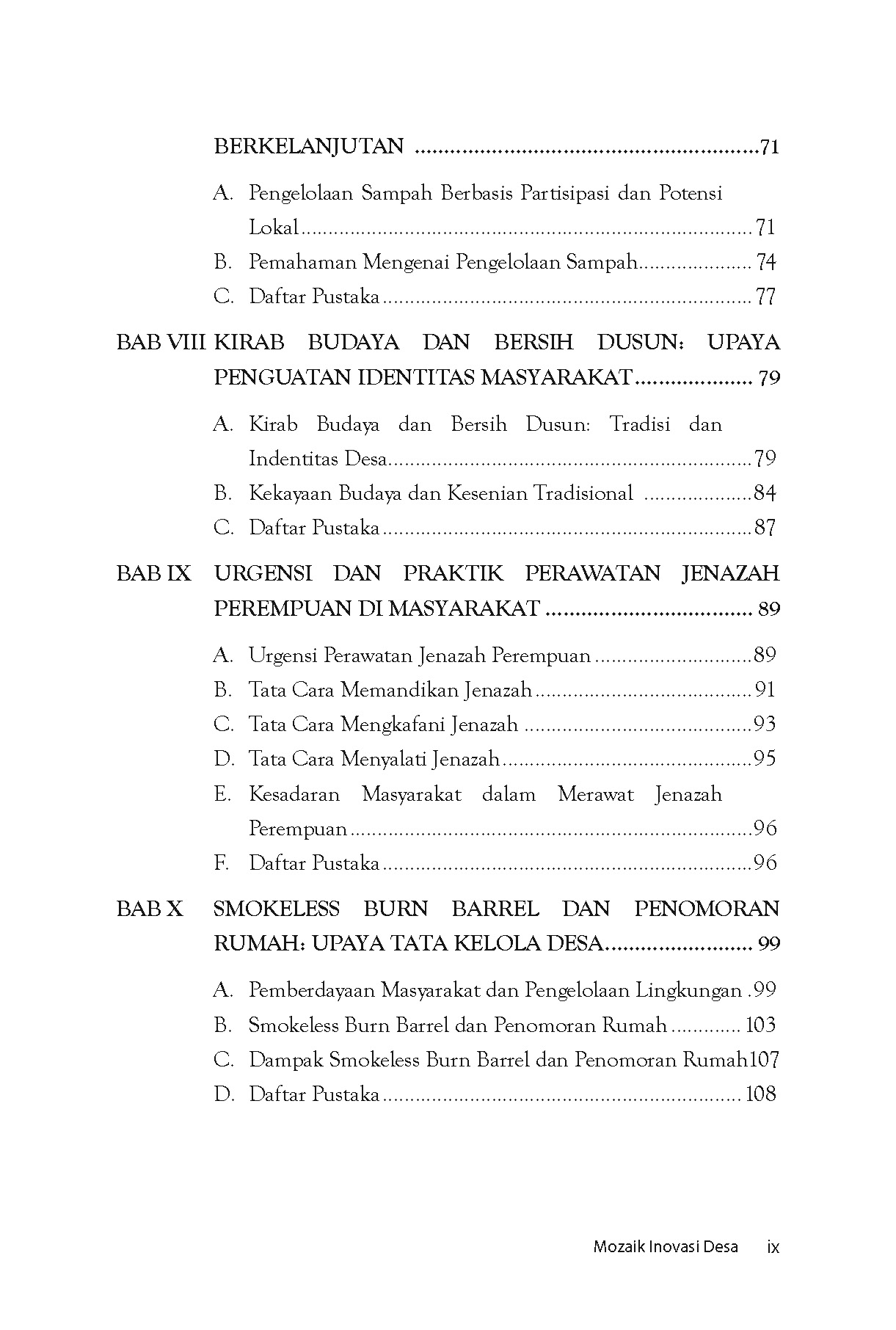 Tidak kalah penting, buku ini juga mengangkat pelestarian budaya dan tradisi lokal, seperti kirab budaya dan bersih dusun, serta praktik perawatan jenazah perempuan sesuai syariat, yang menegaskan nilai-nilai identitas, solidaritas, dan tanggung jawab sosial di masyarakat. Penulis juga menghadirkan inovasi konkret berupa Smokeless Burn Barrel dan penomoran rumah, yang membuktikan bahwa transformasi masyarakat dapat diwujudkan melalui kombinasi pengetahuan, teknologi, dan kolaborasi warga.