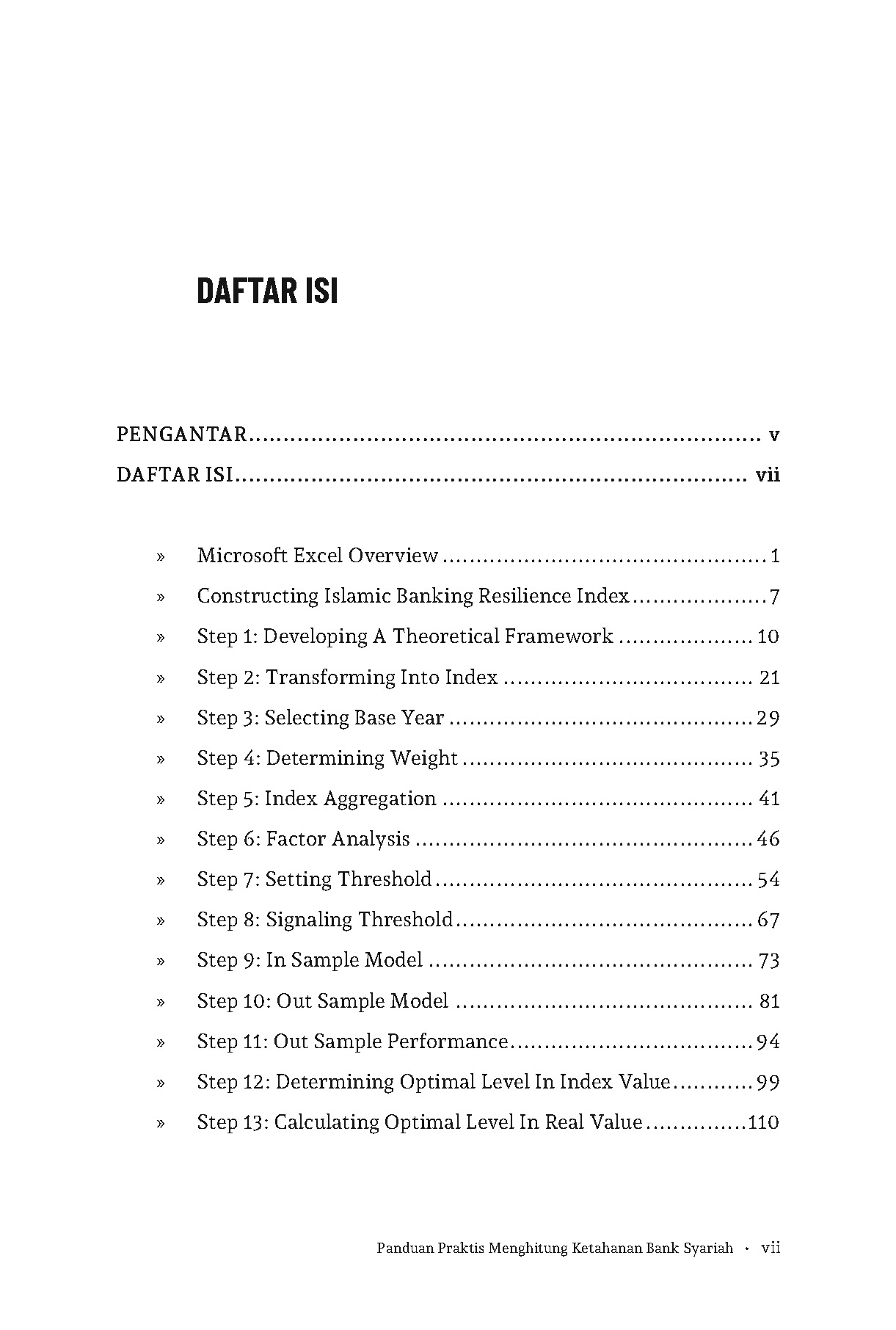 buku ini dapat menjadi panduan teknis dalam membangun indikator komposit berbasis data time series, pendekatan yang disajikan dapat menjadi alternatif alat bantu dalam melakukan monitoring dan evaluasi ketahanan perbankan syariah secara periodik.