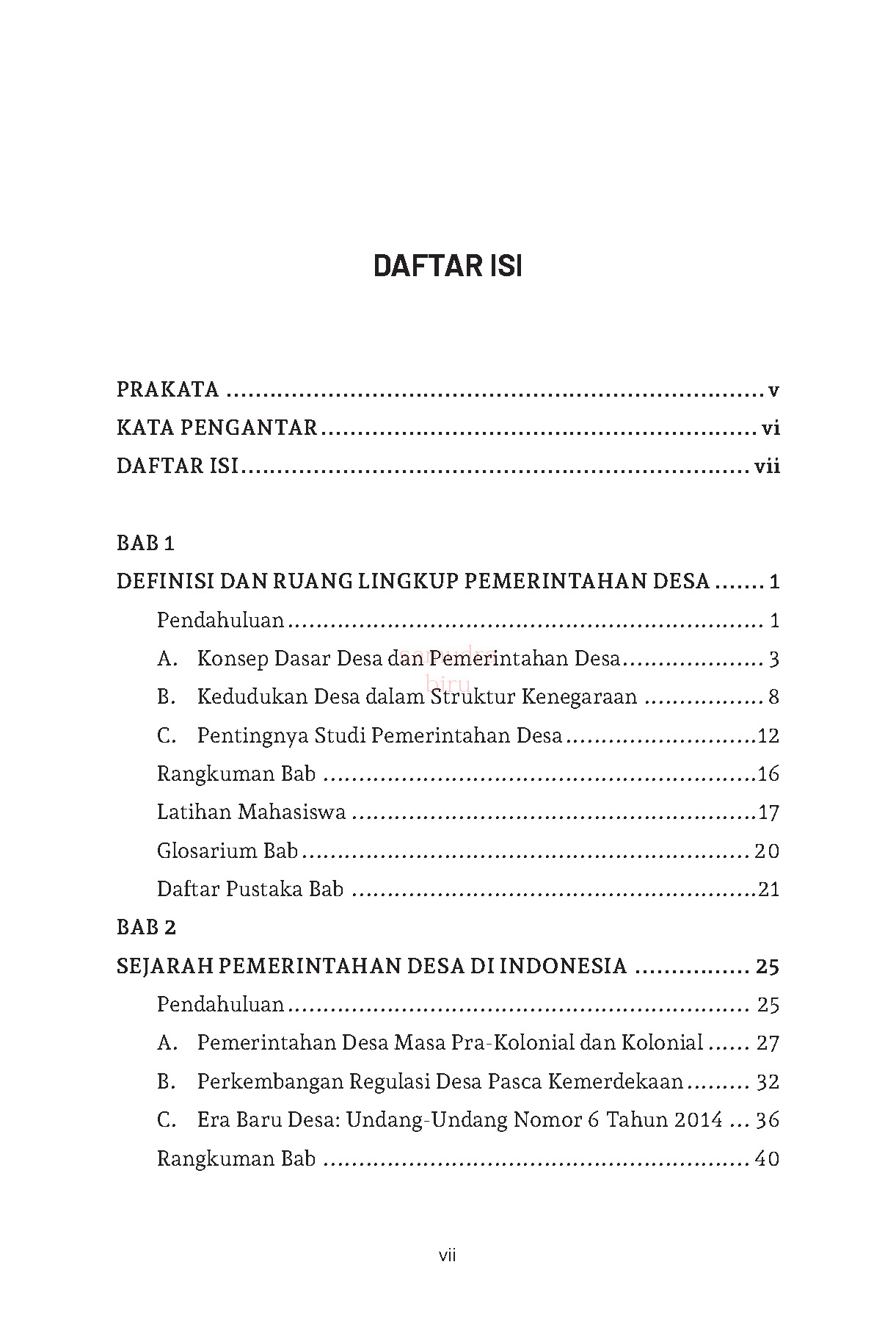 Buku ajar ini disusun sebagai respons atas meningkatnya urgensi pemahaman mengenai pemerintahan desa di Indonesia, khususnya pasca-diundangkannya Undang-Undang Nomor 6 Tahun 2014 tentang Desa. Regulasi tersebut secara fundamental telah mengubah paradigma, kedudukan, dan kewenangan desa, menempatkannya sebagai subjek pembangunan yang otonom dan bukan lagi sekadar objek kebijakan pemerintah pusat. Kompleksitas tata kelola desa, mulai dari perencanaan, keuangan, hingga pelayanan publik, menuntut adanya sumber belajar yang komprehensif, terstruktur, dan relevan dengan dinamika kontemporer. Buku ini dirancang untuk mengisi kekosongan tersebut, dengan menyajikan kerangka teoretis yang kuat, analisis historis yang mendalam, serta pembahasan praktis mengenai penyelenggaraan pemerintahan desa. Tujuan utama penulisan buku ini adalah untuk menyediakan panduan akademik bagi mahasiswa ilmu pemerintahan, ilmu politik, administrasi publik, serta para praktisi seperti aparatur desa, pendamping desa, dan pemangku kepentingan lainnya, agar mampu memahami dan menganalisis isu-isu krusial seputar pemerintahan desa secara kritis dan konstruktif.