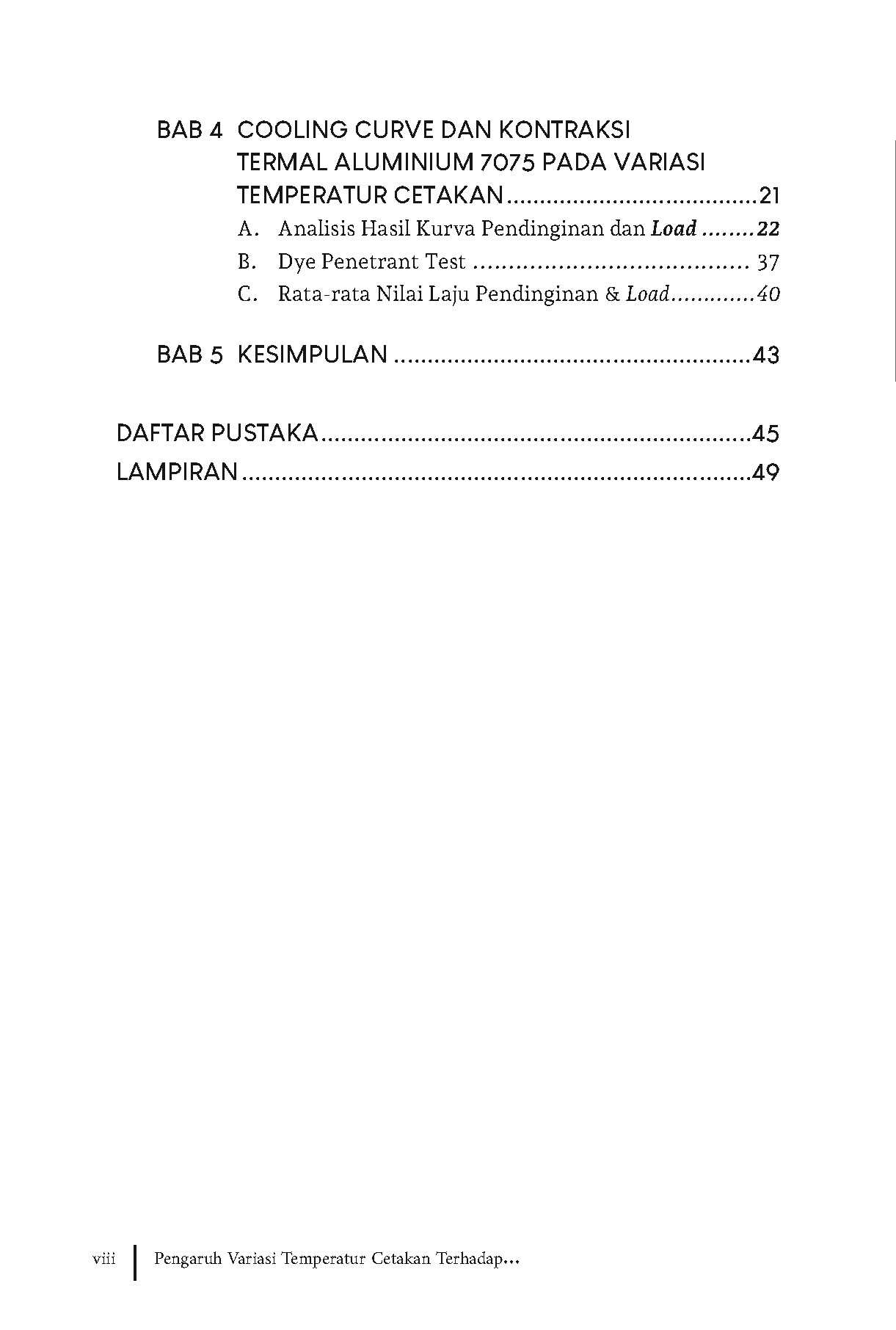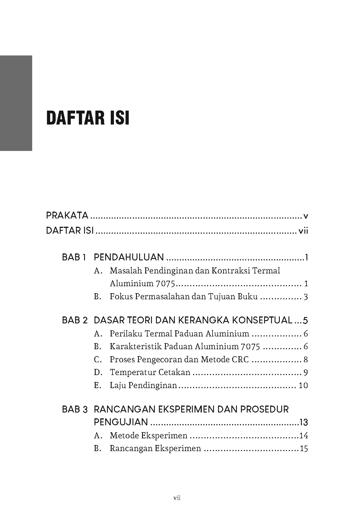 Penyusunan buku ini diawali dengan pemaparan masalah pendinginan dan fokus permasalahan yang diangkat, dilanjutkan dengan landasan teori mengenai perilaku termal paduan aluminium, karakteristik khusus Aluminium 7075, serta konsep dasar proses pengecoran dan laju pendinginan. Pada bagian berikutnya, disajikan rancangan eksperimen dan prosedur pengujian yang digunakan untuk merekam perubahan temperatur dan respon beban selama proses pembekuan, termasuk penggunaan sensor thermocouple, load cell, dan uji dye penetrant untuk mengamati cacat permukaan.