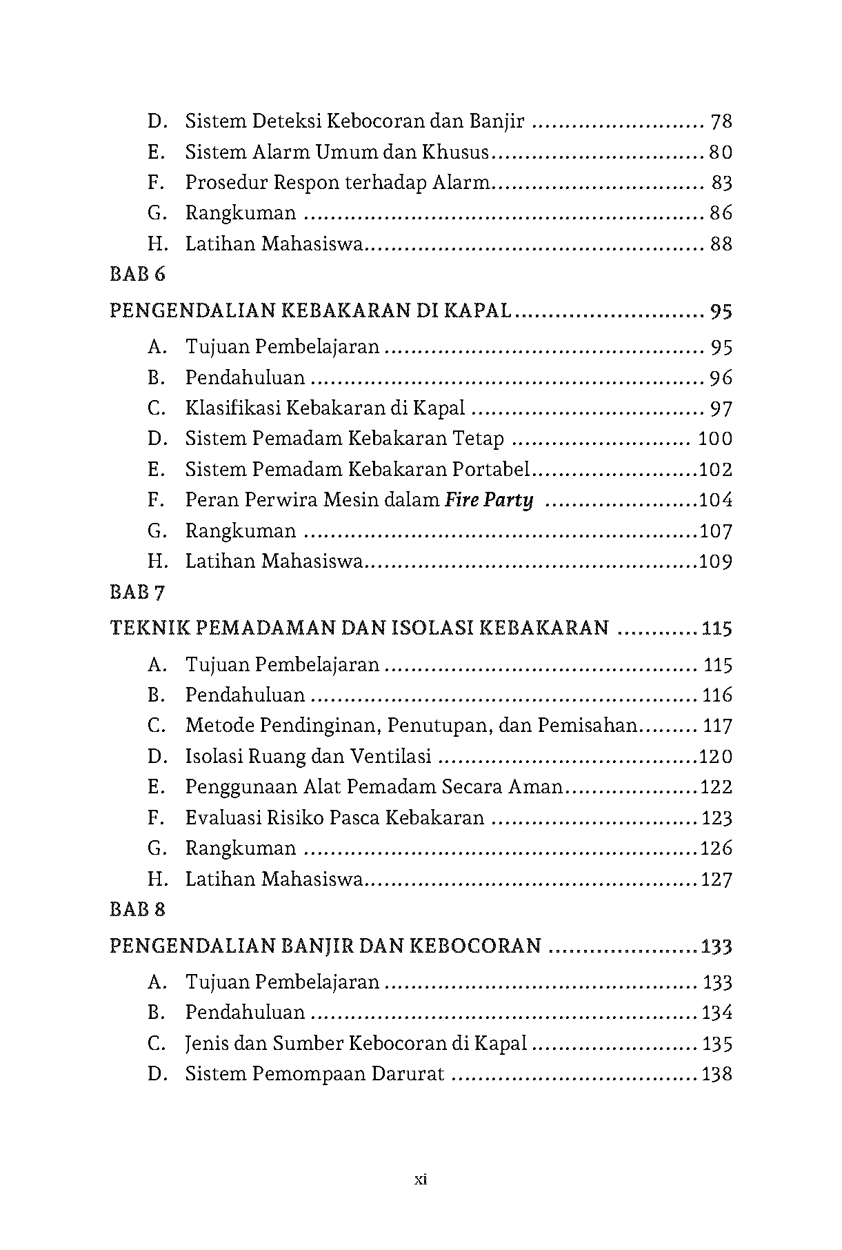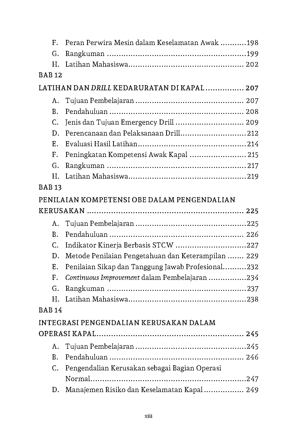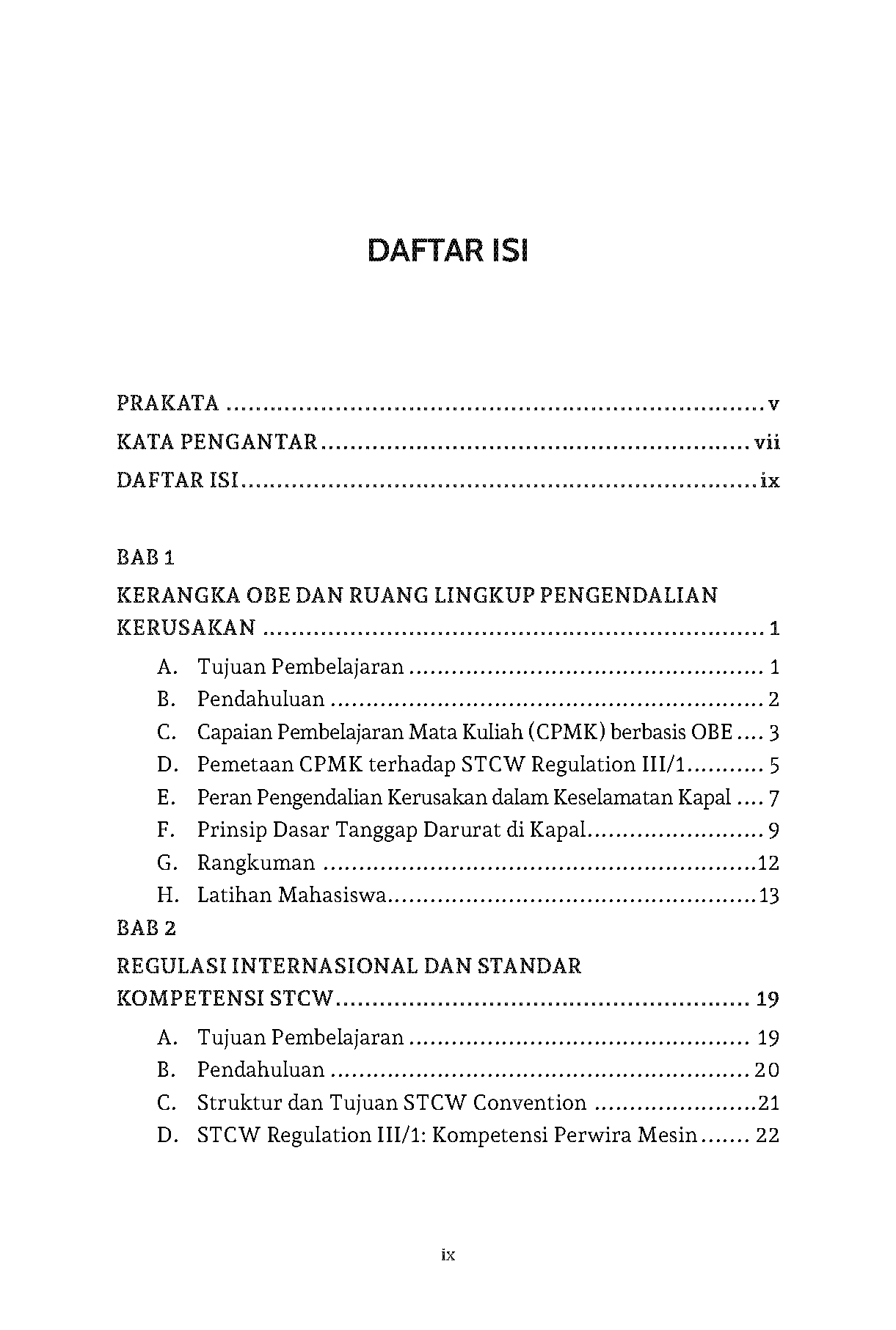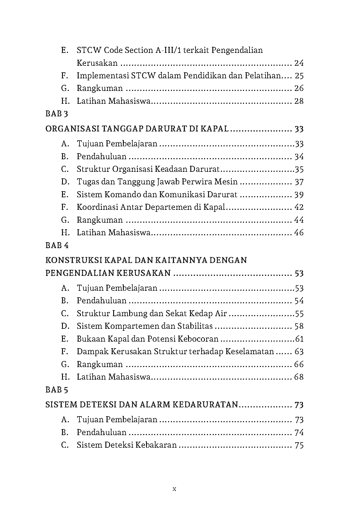Ruang lingkup materi dalam buku ini mencakup aspek-aspek fundamental hingga teknis operasional pengendalian kerusakan dan tanggap darurat, mulai dari kerangka kerja OBE, regulasi internasional, organisasi tanggap darurat, konstruksi kapal, sistem deteksi, hingga teknik pemadaman kebakaran, pengendalian banjir, penanganan kerusakan mesin, kedaruratan bahan berbahaya, evakuasi, latihan darurat, dan penilaian kompetensi. Buku ini secara khusus ditujukan bagi mahasiswa mata kuliah Pengendalian Kerusakan dan Kedaruratan, serta para praktisi di bidang maritim yang ingin memperdalam pemahaman mereka. Saya mengucapkan terima kasih kepada semua pihak yang telah memberikan dukungan dan kontribusi dalam penyusunan buku ini.