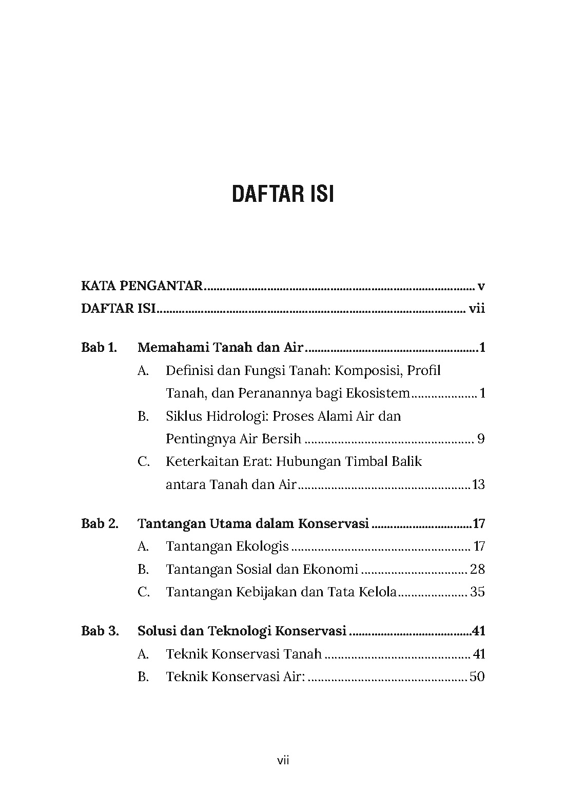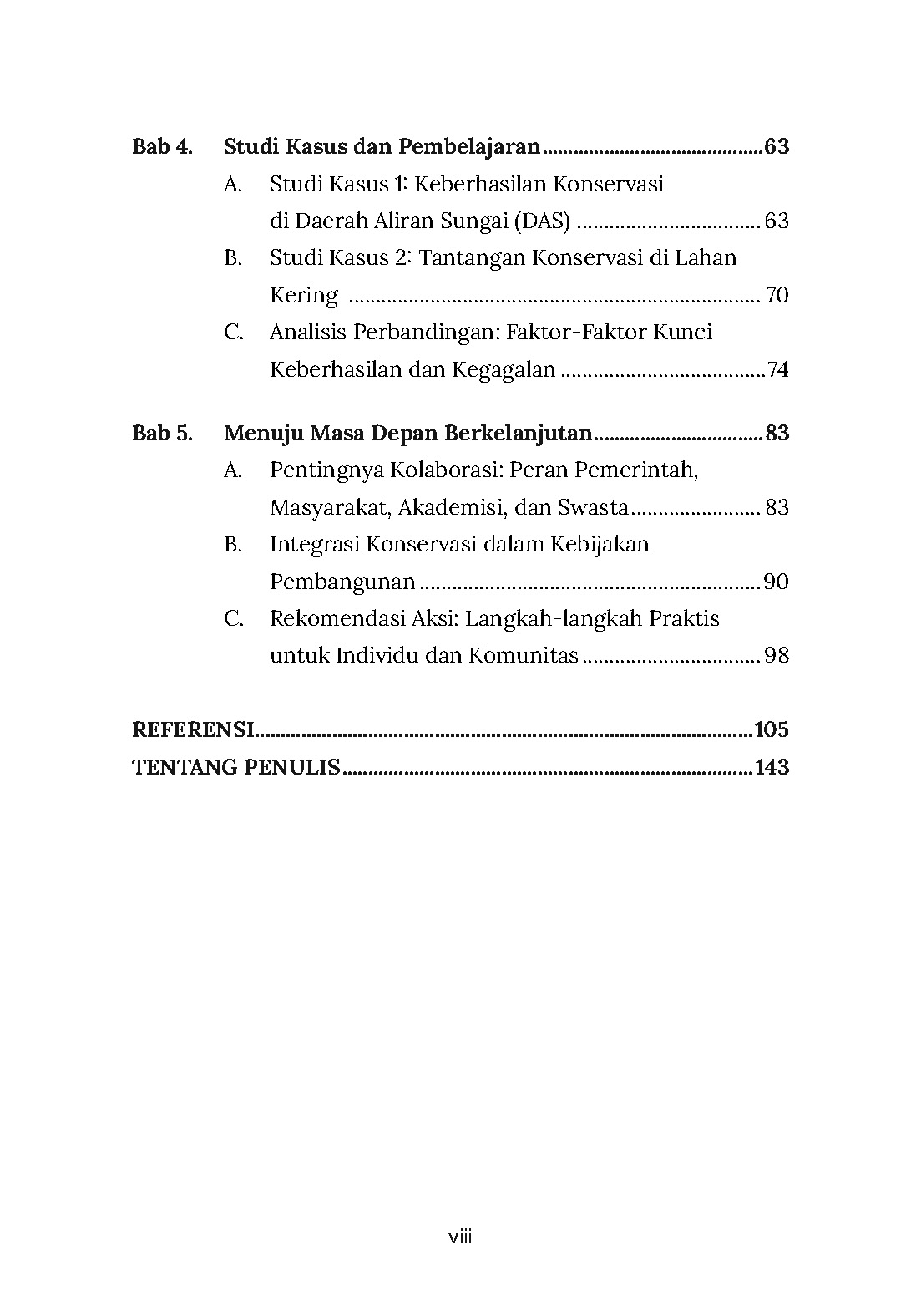 Bagian akhir menekankan pentingnya kolaborasi lintas sektor, penegakan hukum yang kuat, serta edukasi masyarakat untuk mendorong kesadaran lingkungan secara berkelanjutan . Buku ini tidak hanya bersifat informatif tetapi juga menginspirasi tindakan nyata, mengingatkan bahwa keberhasilan konservasi tanah dan air adalah fondasi keberlanjutan ekosistem dan kesejahteraan umat manusia.