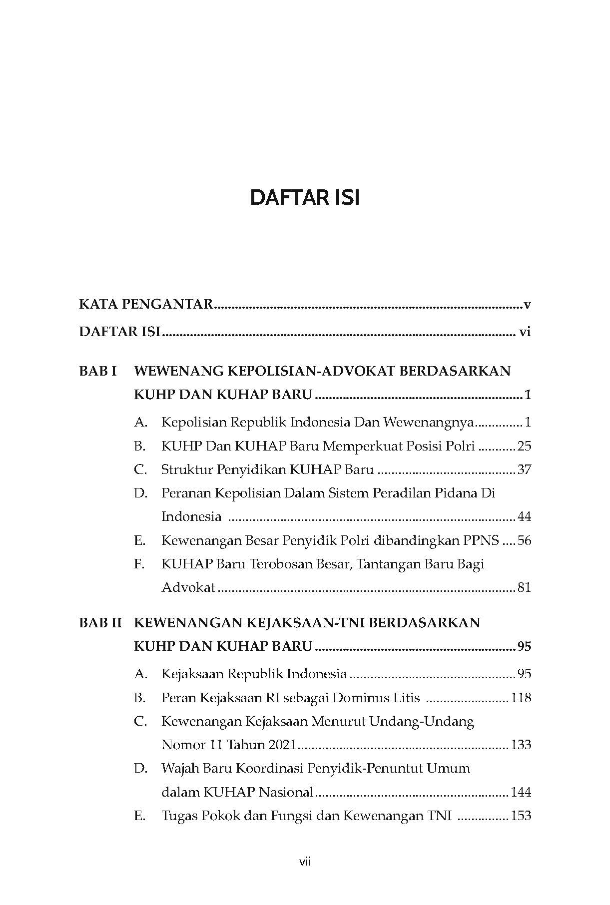 Bab I fokus pada Polri dan advokat dalam konteks KUHP–KUHAP baru: mulai dari kerangka kelembagaan dan wewenang Polri, penguatan posisi Polri, struktur penyidikan, sampai isu perbandingan kewenangan penyidik Polri dengan PPNS. Bab ini juga mengulas perubahan yang menyentuh kerja-kerja pendampingan hukum, termasuk bagaimana pembaruan KUHAP dipandang membawa “terobosan” sekaligus “tantangan” baru bagi profesi advokat. Dalam salah satu pembahasan, buku mengangkat sorotan bahwa aturan-aturan baru masih memerlukan kejelasan teknis agar peran pembela tidak melemah, sekaligus menunjukkan arah penguatan: advokat diposisikan lebih aktif, dapat mendampingi sejak awal, dan hak keberatan yang perlu dicatat dalam BAP.